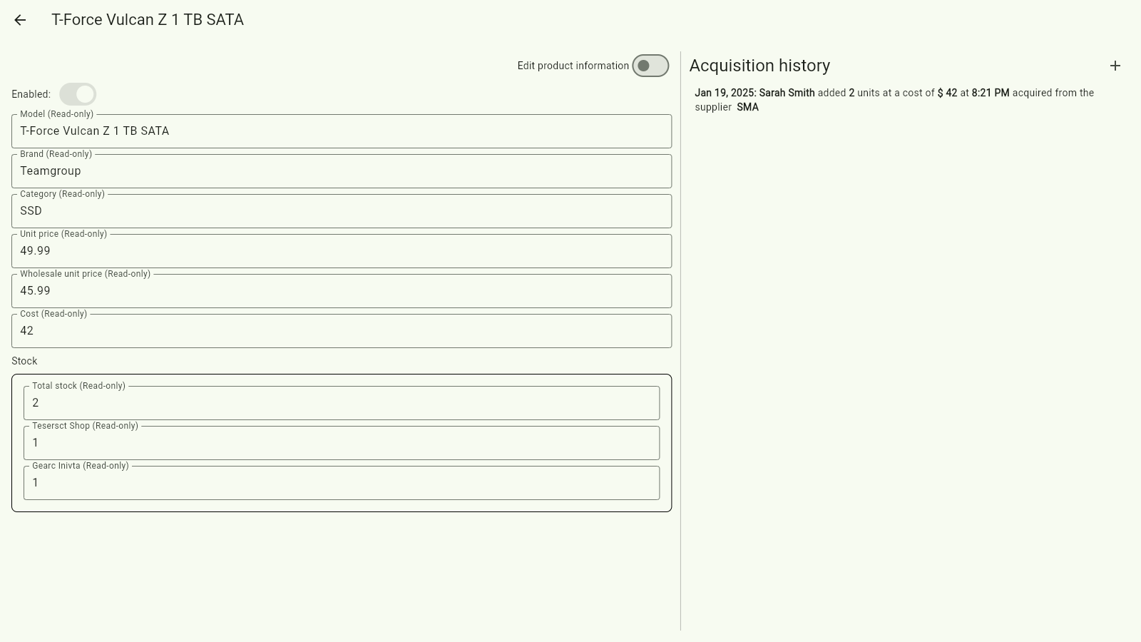 2. Detailed view of individual products, including pricing, stock availability, and sales history.